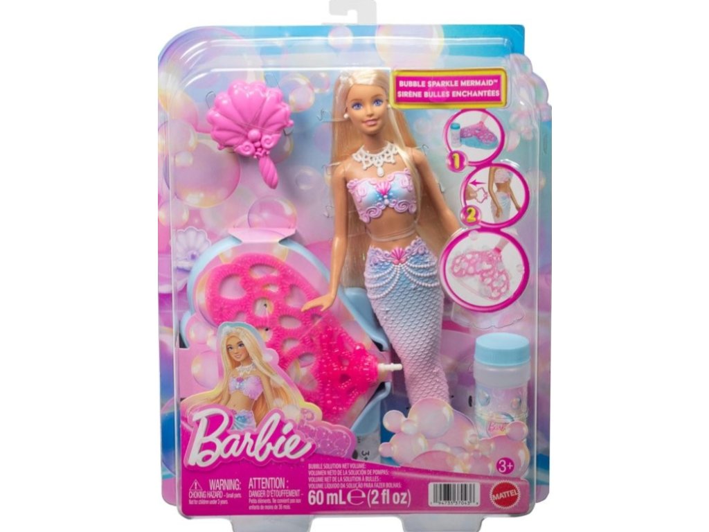 Vytvářejte bubliny s mořskou pannou Barbie! Namočte její krásnou ploutev do misky s bublinkovým roztokem, poté zatáhněte za šňůrku na jejích zádech – ploutev se roztočí a vykouzlí vír bublin!