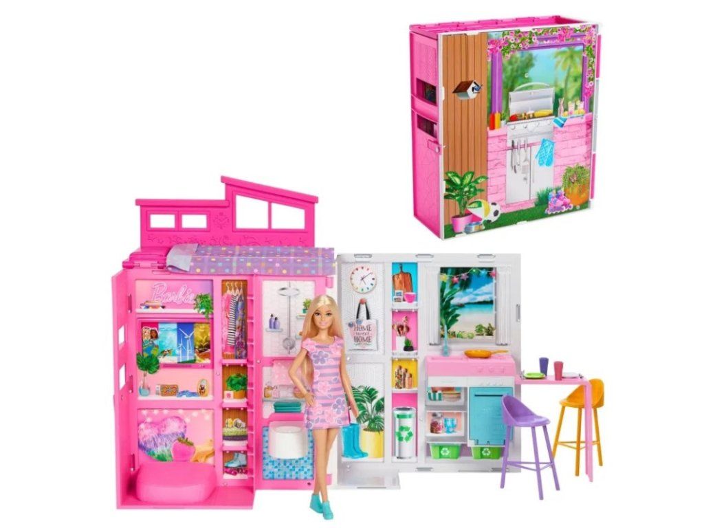 Tento roztomilý, barevný domeček pro panenky Barbie inspiruje k mnoha zábavným dobrodružstvím. Dům si můžeš rozložit, má 4 hrací arény včetně koupelny, kuchyně, podkrovní ložnice a koutku na grilování. Balení obsahuje 1 panenku Barbie a další doplňky. Rozměr domečku: 66 × 43 cm.