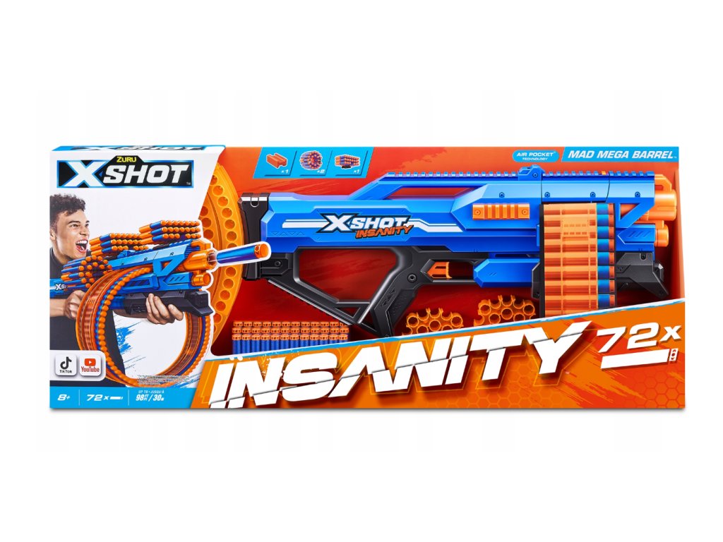 Neuvěřitelná akce s X-Shot Insanity blasterem! S tímto gigantickým blasterem dokážeš zasáhnout cíle až do vzdálenosti 30 metrů. Náboje jsou vybaveny technologií Air Pocket pro rychlejší a přesnější střely na větší vzdálenosti. Balení obsahuje 72 nábojů. Velikost 84 cm.