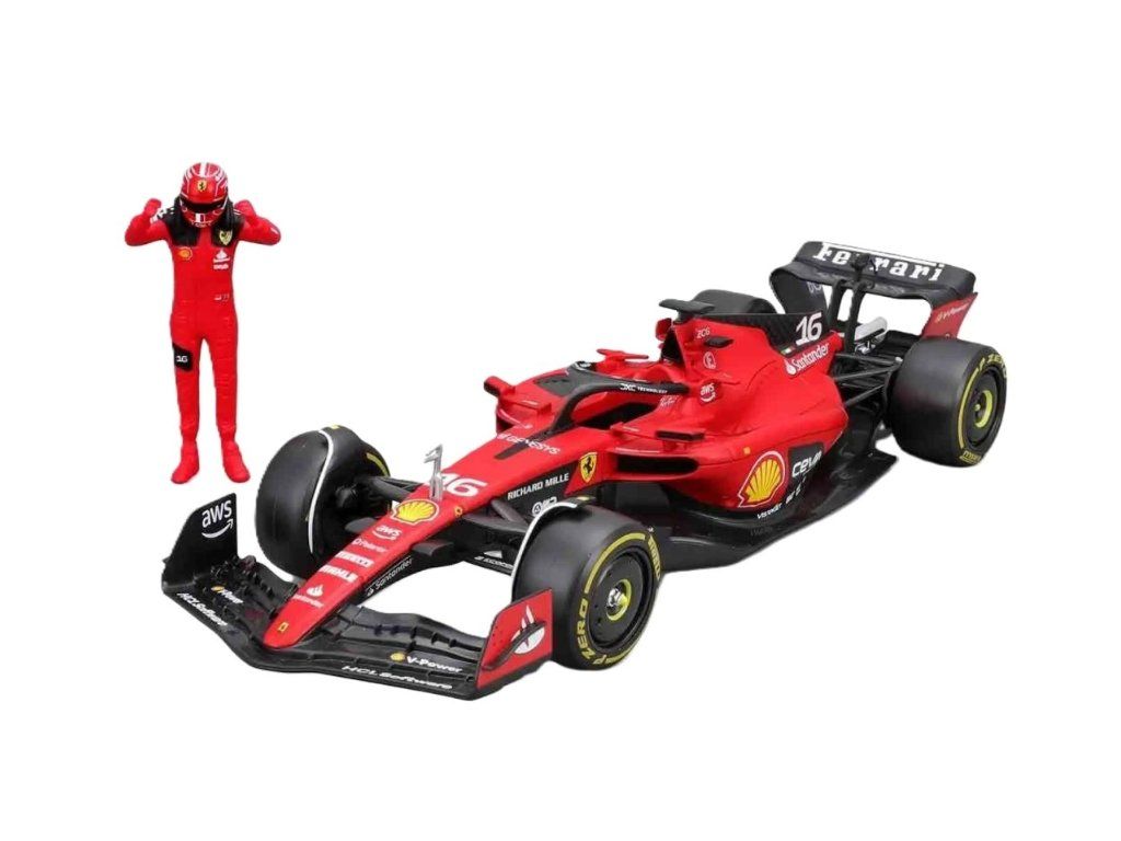 Zbrusu nový model vozu Ferrari SF-23 #16 Charles Leclerc "Formula One F1 World Championship" (2023) v měřítku 1:24 s figurkou jezdce od značky Bburago.