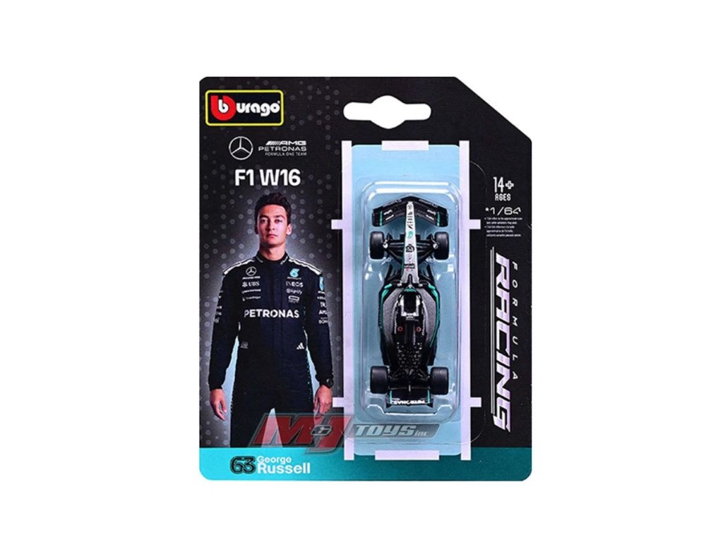 Závodní model Mercedes-AMG F1 W16 2025 #63 George Russell od Bburago v měřítku 1/64 nabízí detailní realismus závodních vozů pro fanoušky F1 a sběratele diecastů.