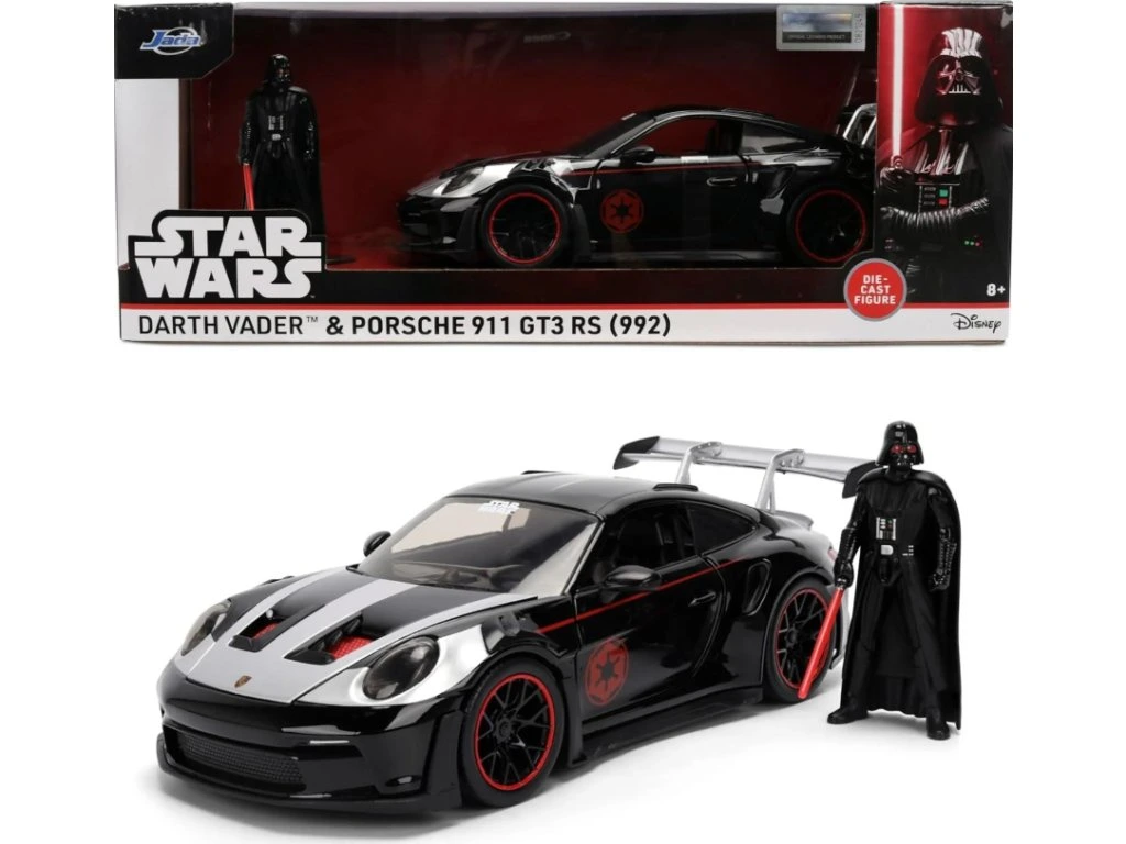 Pocítíte Sílu rychlého pruhu s touto energickou fúzí muscle caru a Sithského Lorda. Star Wars Darth Vader Porsche 99 GT3 RS od Jada Toys kombinuje styl temné strany s drsnou silniční silou.