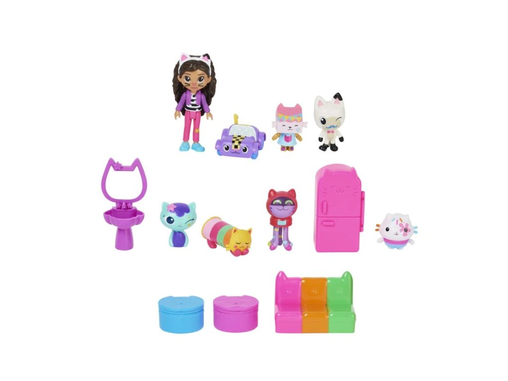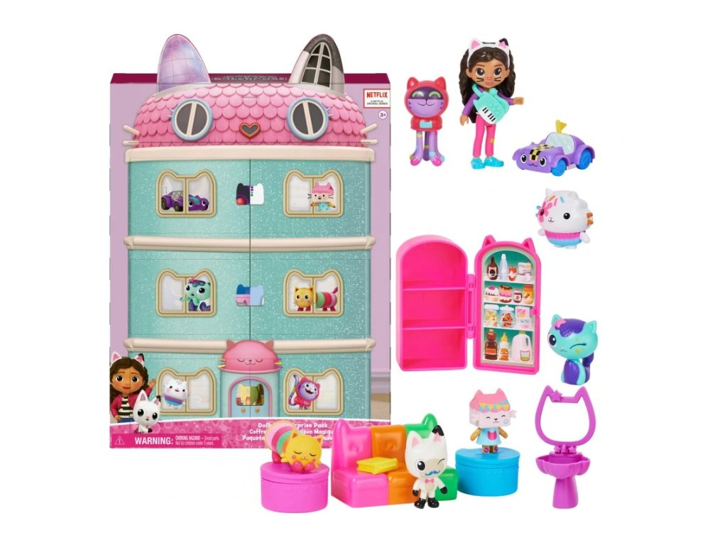 Sada kočičího domečku Gabi s překvapením je domeček pro panenky, který skrývá mnoho překvapivých prvků. Balení obsahuje figurku Gabi o velikosti přibližně 10 cm, 7 figurek koček, 3 kusy nábytku, 2 doplňky a 2 krabice s překvapením. Celkem až 15 prvků! Okénka kartonové krabice lze otevírat a zavírat - za každým okénkem je barevná místnost, do které lze postavit přiložené figurky a doplňky.