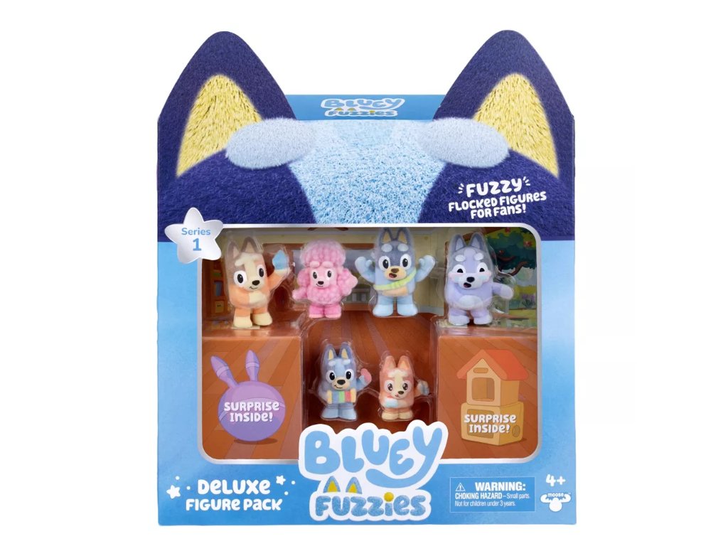 Obsahuje šest známých figurek Bluey Fuzzies a dvě záhadné figurky.