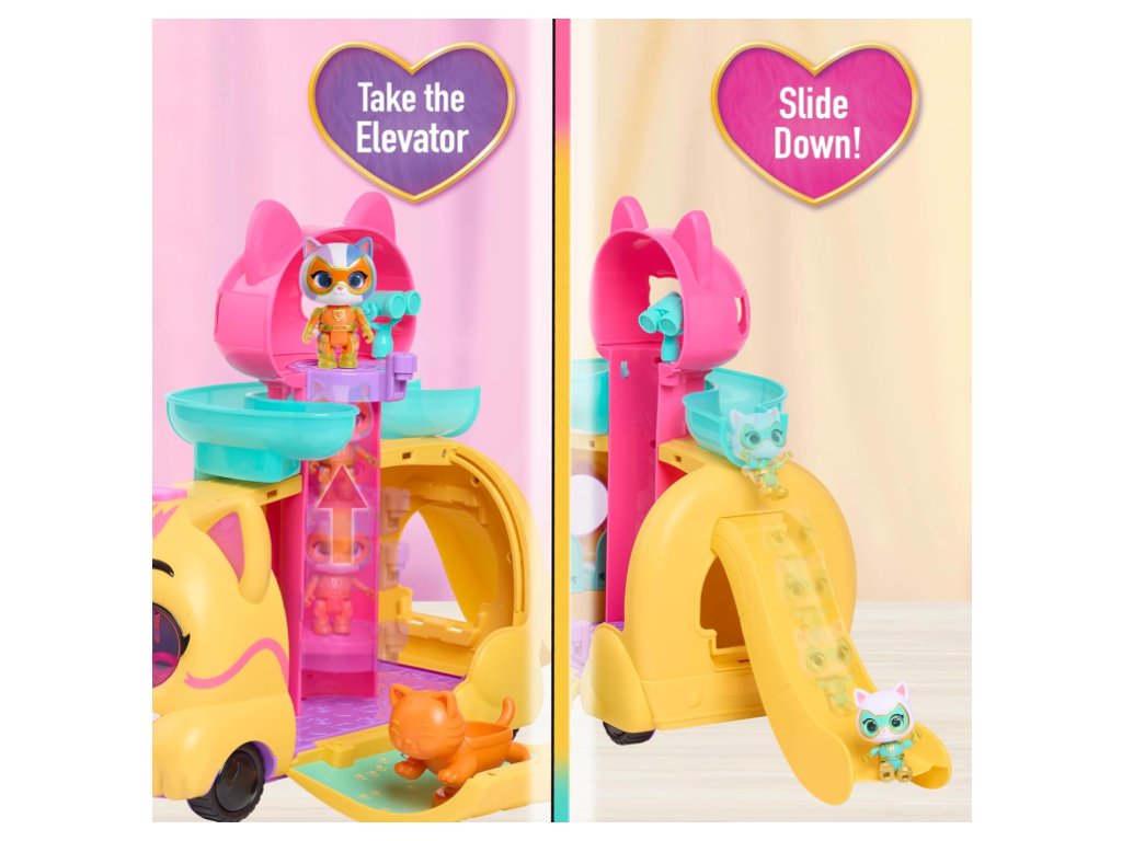 Koťátka se vydávají na cestu s herní sadou Disney Junior SuperKitties Purr N Go! Toto barevné vozidlo ve tvaru kočky je plné prvků pro nekonečnou zábavu, včetně volně se otáčejících kol, výtahu, skluzavky, vyhlídkového sloupu a dalších prvků. Herní sada obsahuje kloubové figurky Bitsyho a Buddyho, robotického prasečího kamaráda Wigglese, jámu s míčky, kočičí věž, vitrínu, kočičí hračku na hřiště, dalekohled a plastovou klubko. Stisknutím tlačítka aktivujete svítící uši a uslyšíte fráze a zvukové efekty z předškolní série Disney Junior SuperKitties. Nastavte figurky tak, aby si hrály v jámě s míčky, sjížděly se po skluzavce nebo se svezely výtahem. Po skončení hraní uložte vše do herní sady a vydejte se vstříc dalšímu dobrodružství. Pro ještě větší zábavu plnou předení přidejte další figurky a herní sady SuperKitties (prodávají se samostatně). Předškolní hračky Disney Junior SuperKitties jsou skvělým překvapením k narozeninám nebo kdykoli jindy pro děti od 3 let. Vyžaduje 3 baterie AAA (součástí balení).