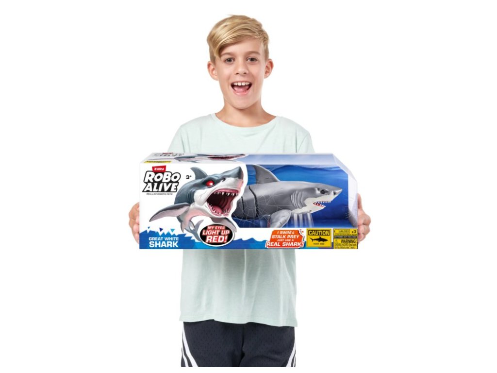 Dokonale propracovaný robo žralok, který opravdu plave ve vodě. Jeho oči se dokáží rozsvítit červeně. Jeho zadní ploutev se pohybuje stejně jako skutečnému žralokovi. Velikost žraloka je přibližně 33 cm. Potřebné baterie 3x 'AAA' (nejsou součástí)