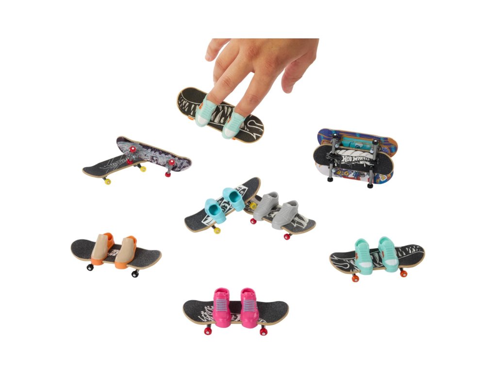 Pět párů odnímatelných bot na skateboard ve shodných barvách pomáhá zvládat triky a lze je zaměnit se všemi hmatníky Hot Wheels Skate.