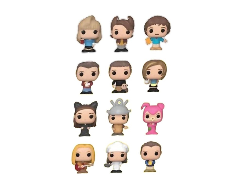 Je tu Bitty Pop! Rachel Green (Vlasy 80. let), Bitty Pop! Chandler Bing (Vlasy 80. let), Bitty Pop! Ross Geller (Vlasy 80. let), Bitty Pop! Joey Tribbiani, Bitty Pop! Ross Geller, Bitty Pop! Rachel Green, Bitty Pop! Monica Geller (Halloweenský kostým), Bitty Pop! Ross Geller (kostým halloween), Bitty Pop! Chandler Bing (Halloweenský kostým), Bitty Pop! Phoebe Buffay, Bitty Pop! Monica Geller a Bitty Pop! Chandler Bing.