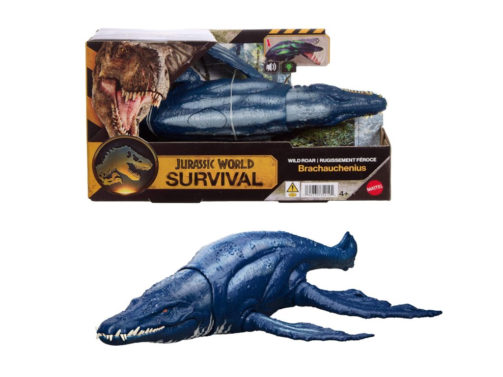 Tato dinosauří hračka Brachauchenius s divokým řevem z Jurského světa má dramatická světla i zvuky! Stisknutím tlačítka aktivujete útok klesajícím kouskem, doprovázený divokým řevem, se světelnými efekty, které umocní vzrušení. Tato 30 cm dlouhá figurka vodního dinosaura má pohyblivé klouby, připravené pro vzrušující hraní a vystavování s dinosaury. Naskenujte sledovací kód na dinosauří noze v bezplatné aplikaci Jurassic World Play pomocí kompatibilního chytrého zařízení (Android nebo iOS, není součástí balení), abyste odemkli digitální verzi dinosaura a mohli si zahrát tuto divoce zábavnou hru, v níž závodíte s vozidly na souši, ve vzduchu i na moři. Vhodné pro fanoušky dinosaurů od 4 let.