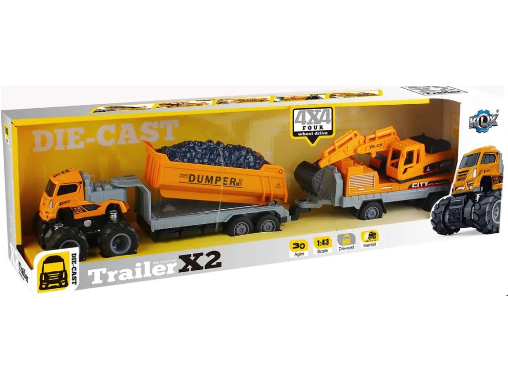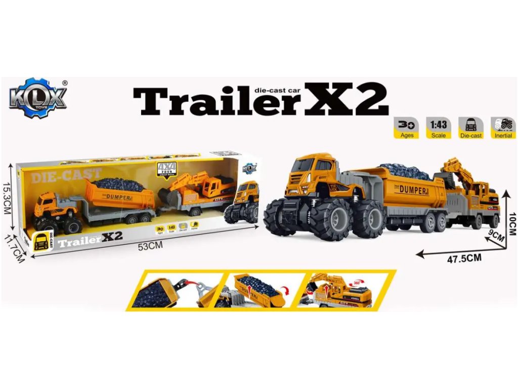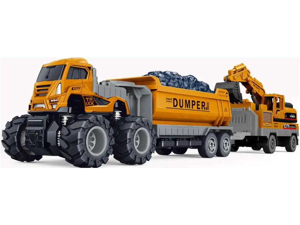 Sklápěč s dvojitými závěsy, kde jeden závěs má naklápěcí funkci a je naložen „kameny“, a druhý závěs je dodáván s namontovaným bagrem. Vozidlo má pohon všech kol a je vybaveno třecím mechanismem, takže se při zatlačení stále pohybuje vpřed.