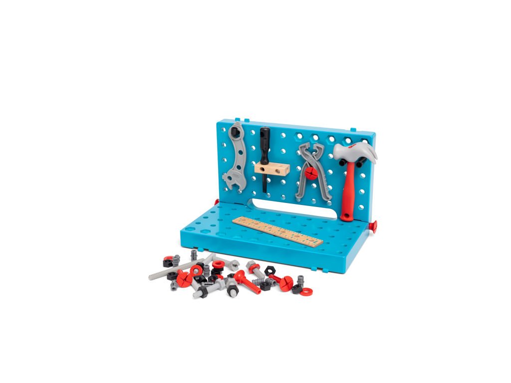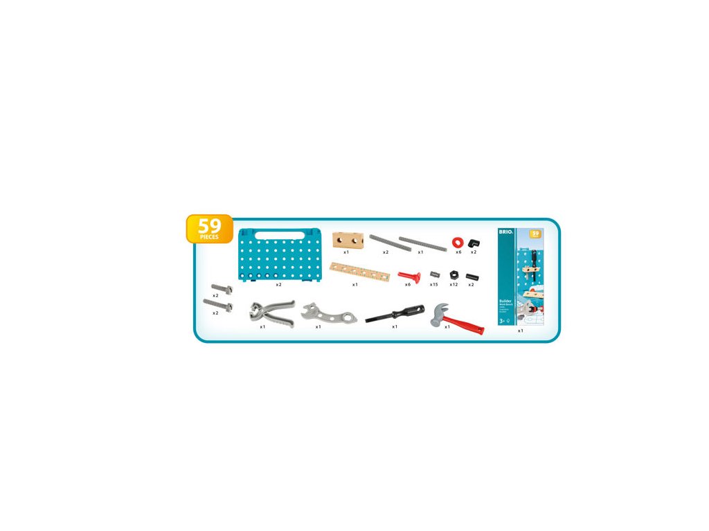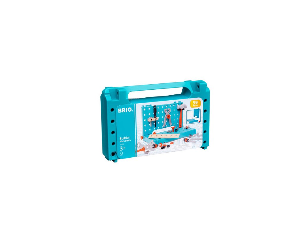 Tlučte, šroubujte, montujte a dotahujte s 34596 BRIO BUILDER Pracovním stolem s nářadím. Tato stavební hračka je skvělým prostředkem pro děti se zájem o hraní na stavitele. Flexibilní konstrukce pracovního stolu umožní dětem kreativně používat nářadí, jako jsou kladiva, klíče, šroubováky atp. Až si pohrajete, stůl jednoduchým složením proměníte v praktický kufřík na nářadí a snadno uložíte.
