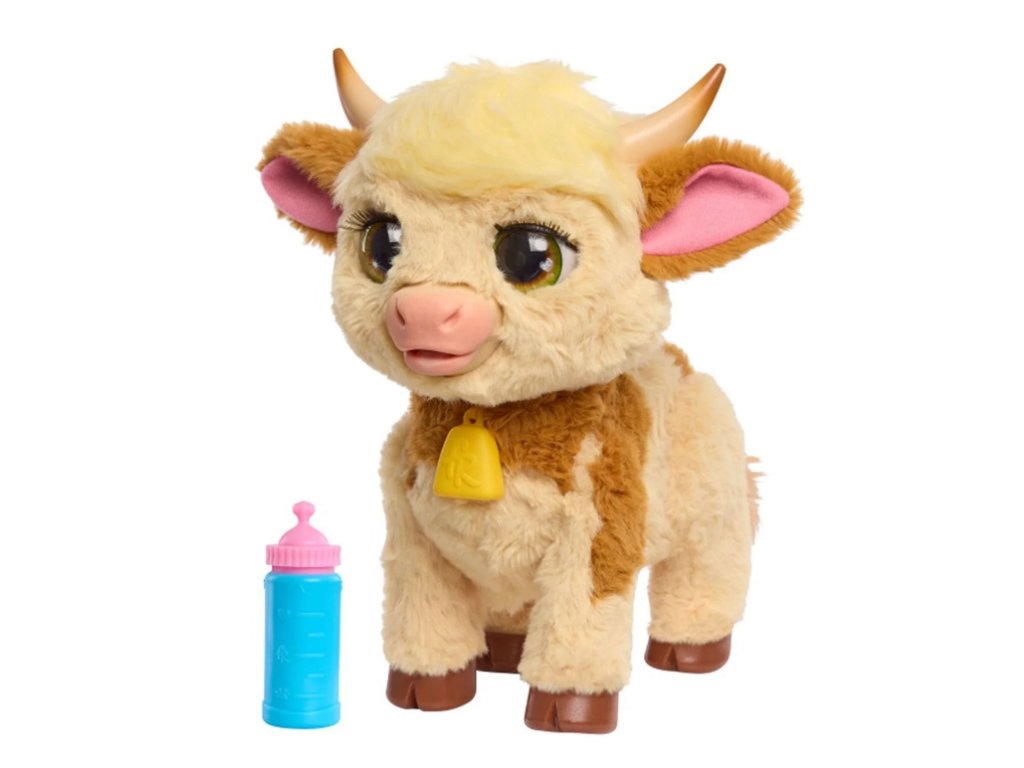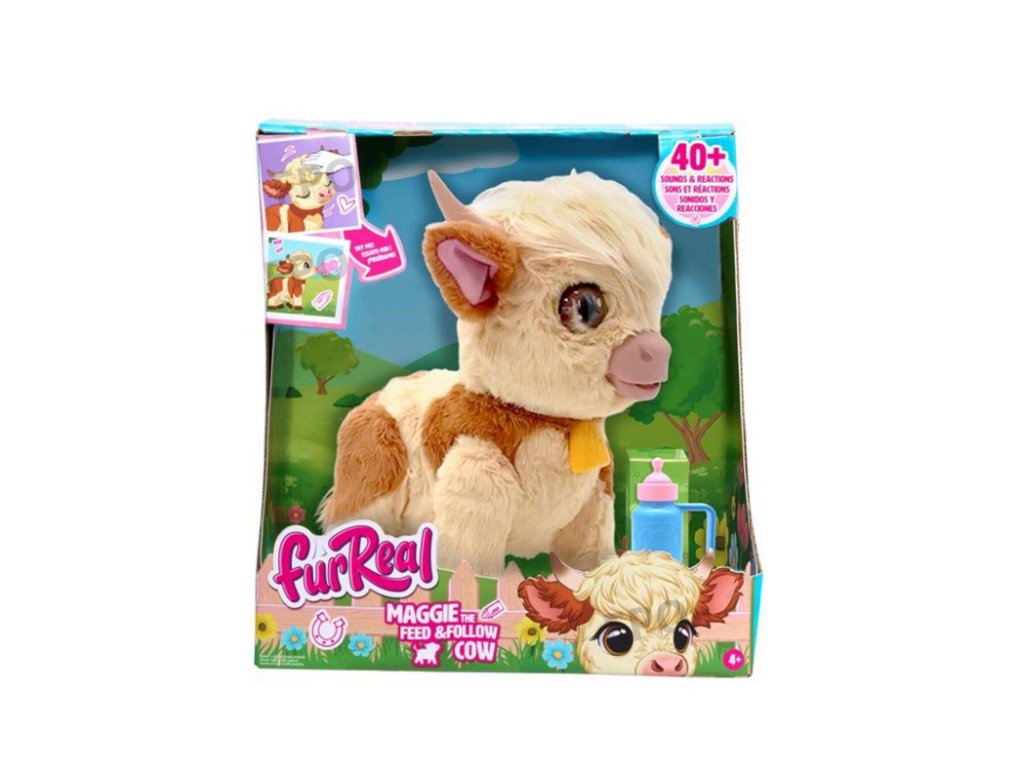 Připravte se na zábavu s farmářskými mazlíčky, maximální chichotání a chlupatou krávu Maggie. Tento bučící mini mazlíček pochází ze Skotské vysočiny a nabízí více než 50 různých kombinací zvukových a pohybových reakcí. Tento animovaný plyšák, vysoký 28 cm, je vždy připraven na svačinu a procházku. Posuňte přepínač na jejím břiše do polohy „zapnuto“ a začněte si hrát. Pohlaďte ji po hlavě dopředu, abyste jí uhladili nadýchaný chomáč chlupů, a uslyšíte různé roztomilé bučení, smích a další zábavné zvuky mini krav. Pohlaďte Maggie po hlavě, abyste aktivovali mrkání jejích roztomilých hnědých a zelených očí. Stiskněte tlačítko na jejích zádech pro aktivaci chůze a vrtění jejího chlupatého ocásku. Pak je čas na svačinu! Vložte jí láhev do úst, otočte s ní a veďte Maggie při chůzi. Poslouchejte rozkošné zvuky kravského zvonku, srkání a srkání. Vyžaduje 4 baterie AA (jsou součástí balení). Tato rozkošná animovaná plyšová hračka pro děti je skvělým překvapením pro milovníky zvířat od 4 let.