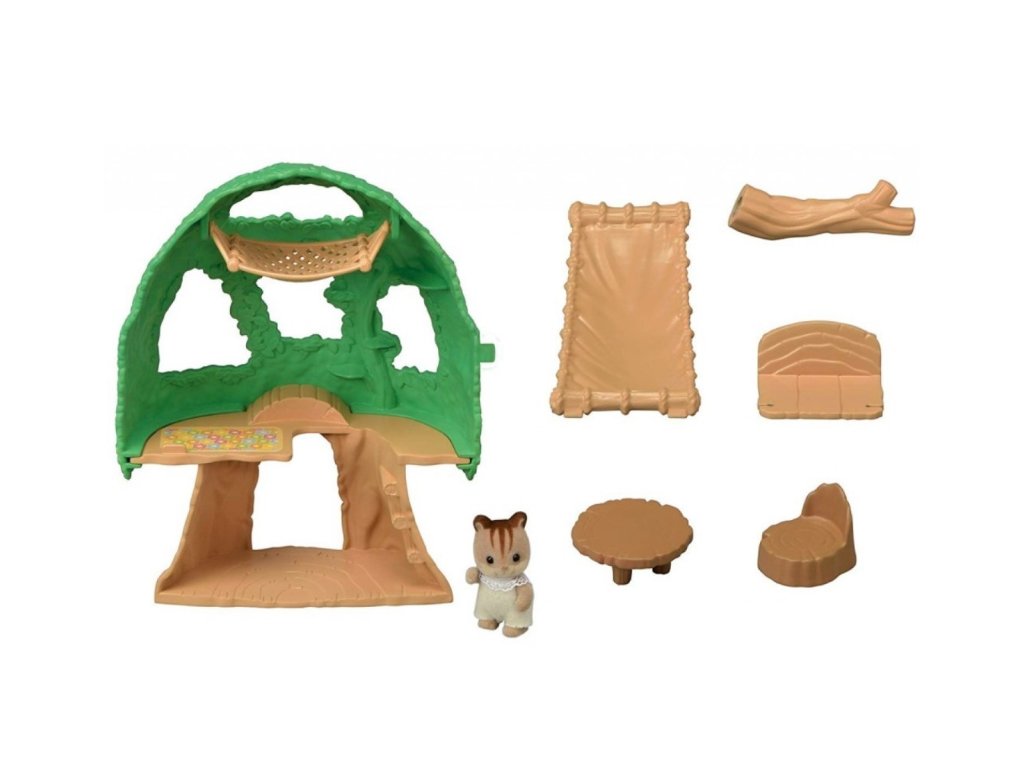 Obsahuje miminko oříškových veverek (ostatní figurky se prodávají samostatně), prolézací strom, skluzavku, houpačku, houpací síť, stoleček a židličku.
