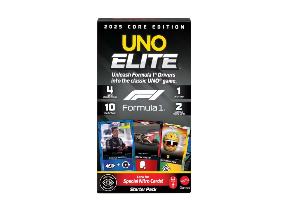 Tato energická karetní hra UNO Elite Formule 1 spojuje strategii klasického UNO s adrenalinem závodů Formule 1! Vzrušení začíná plným balíčkem 112 karet UNO a zrychluje se 40 náhodnými akčními kartami Formule 1 Elite (ve čtyřech posilovacích balíčcích) a dvěma promočními kartami. UNO Elite Formule 1 se hraje jako klasické UNO, ale akce jako Přeskočit a Zpět se nacházejí na akčních kartách Elite. Každá akční karta Elite má svou vlastní speciální schopnost, která se aktivuje, když hráč zahraje kartu s ikonou Elite. A když vám zbývá poslední karta, nezapomeňte zakřičet „UNO!“. Hra se závodní tematikou je vzrušujícím dárkem pro fanoušky Formule 1 a milovníky karetních her od 7 let.