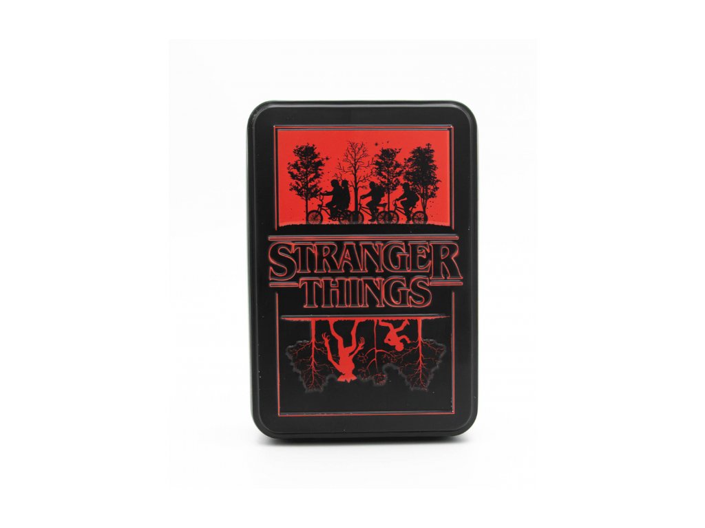 Stylové hrací karty s grafikou ze seriálu Stranger Things v plechovce. Balíček obsahuje standardní sadu 54 karet na kvalitním papíře.