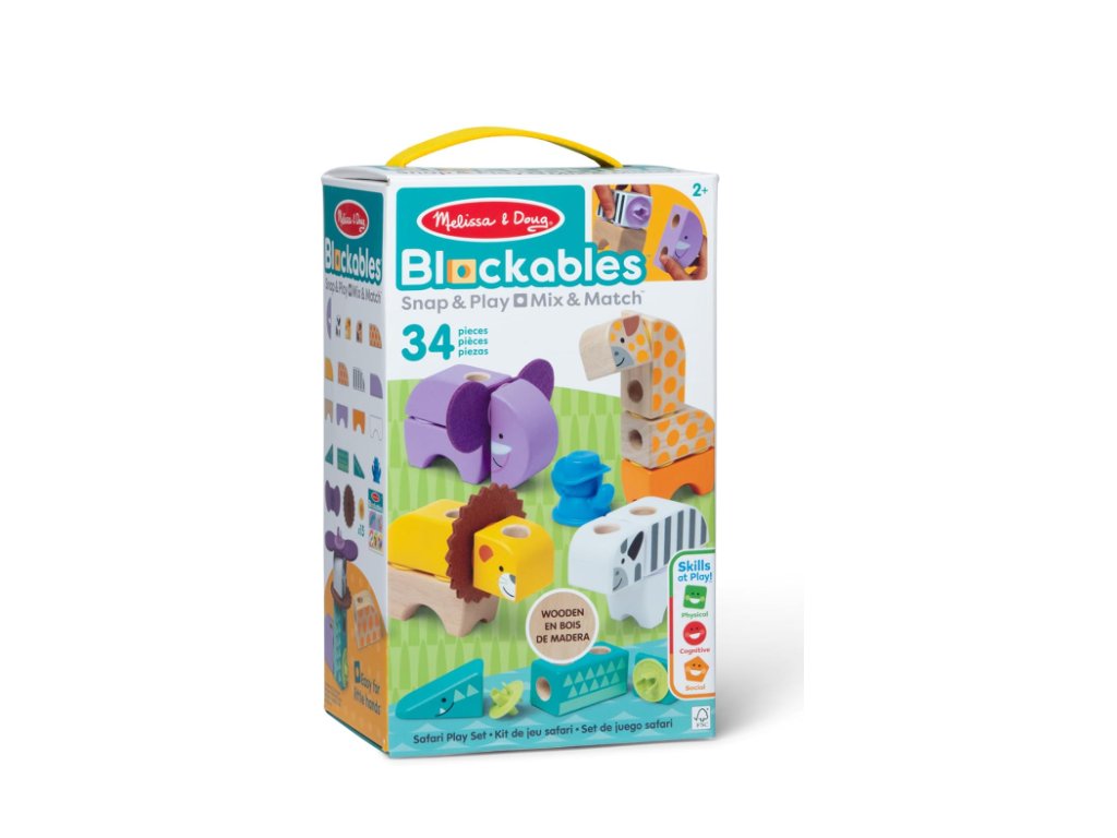 Sada se skládá z 34 dřevěných dílků, snadno uchopitelných a perfektních do dětských rukou. Nádoba s rukojetí obsahuje mimo jiné postavičky se zvířátky a vzory související se Safari . Po naskládání na sebe bloky procvičují koordinaci oko-ruka a motoriku, stimulují smysly a poskytují dlouhotrvající zábavu. Bloky jsou vyrobeny z FSC certifikovaného dřeva.