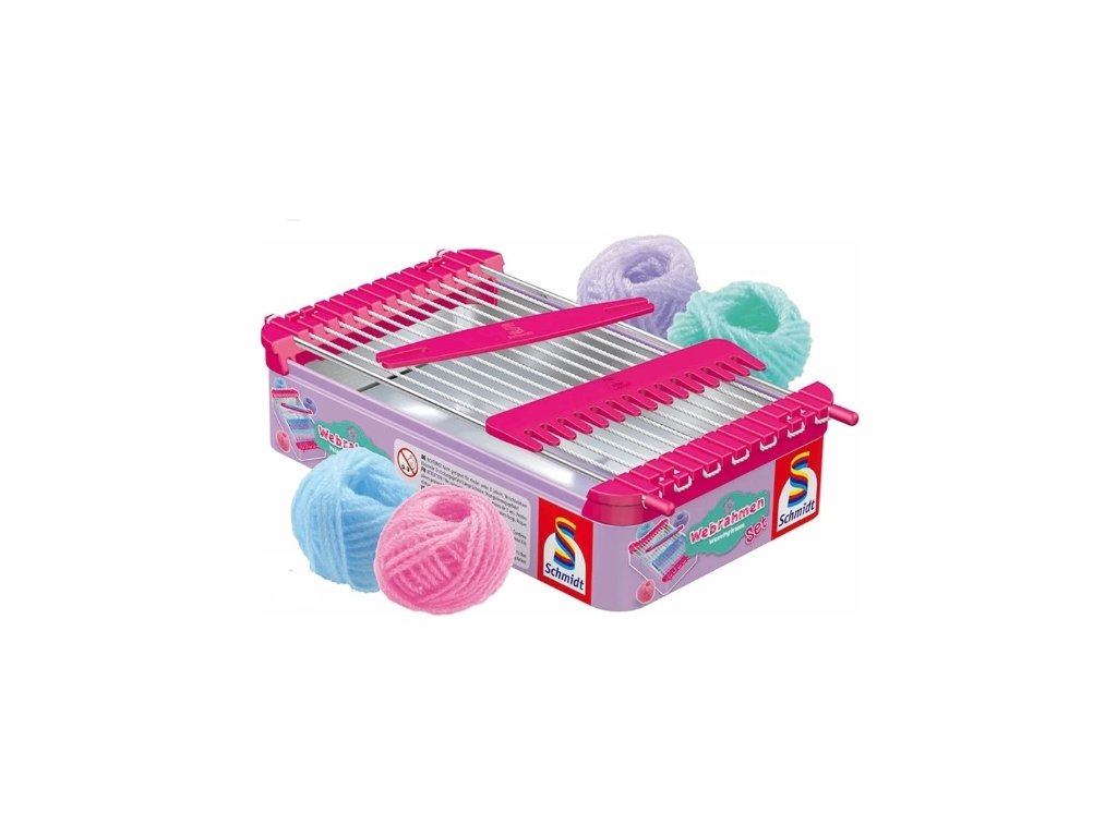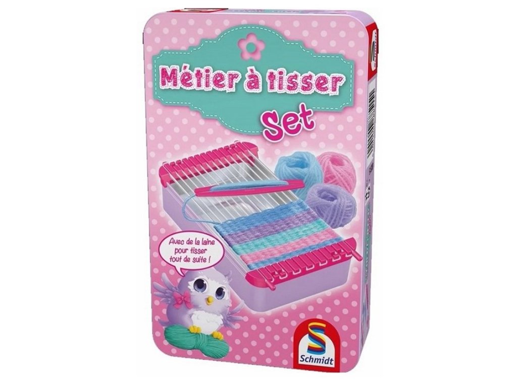 V plechové krabičce, balení obsahuje: tkalcovský člun, hřeben, vlna ve čtyřech barvách po 6m, osnovní nit