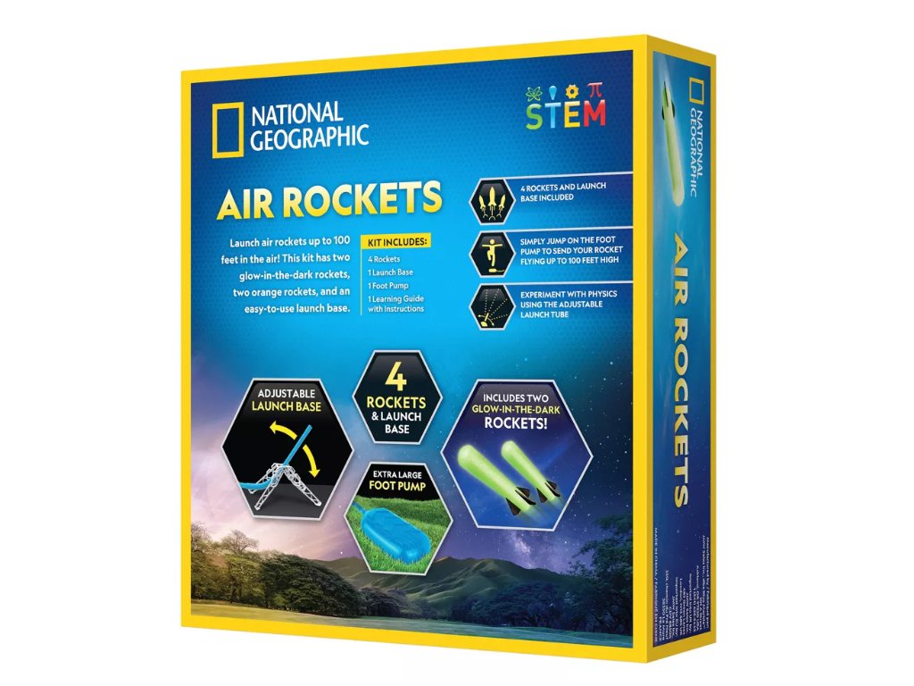 Vyšlete rakety poháněné vzduchem až do výšky 30 metrů s raketami National Geographic Air Rockets! Jedná se o skvělou stavebnici pro děti, která podporuje fyzickou hru a zároveň zábavnou formou učí vědu. Sestavení je rychlé a snadné. Jednoduše nainstalujte nohy odpalovací základny, nasaďte raketu a poté sešlápněte nožní pumpu, abyste vyslali rakety do nebe! Sada obsahuje dvě zářivě oranžové rakety a dvě rakety svítící ve tmě, takže je skvělá pro použití ve dne i v noci! Odpalovací trubice je nastavitelná, takže děti mohou experimentovat s letovými dráhami a trajektoriemi, a podrobný výukový průvodce poskytuje vhled do vědy o létání! Pořiďte si rakety National Geographic Air Rockets ještě dnes!