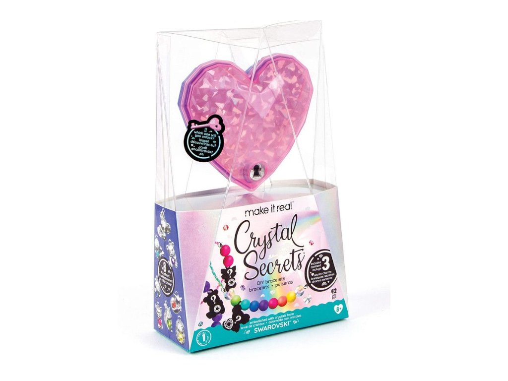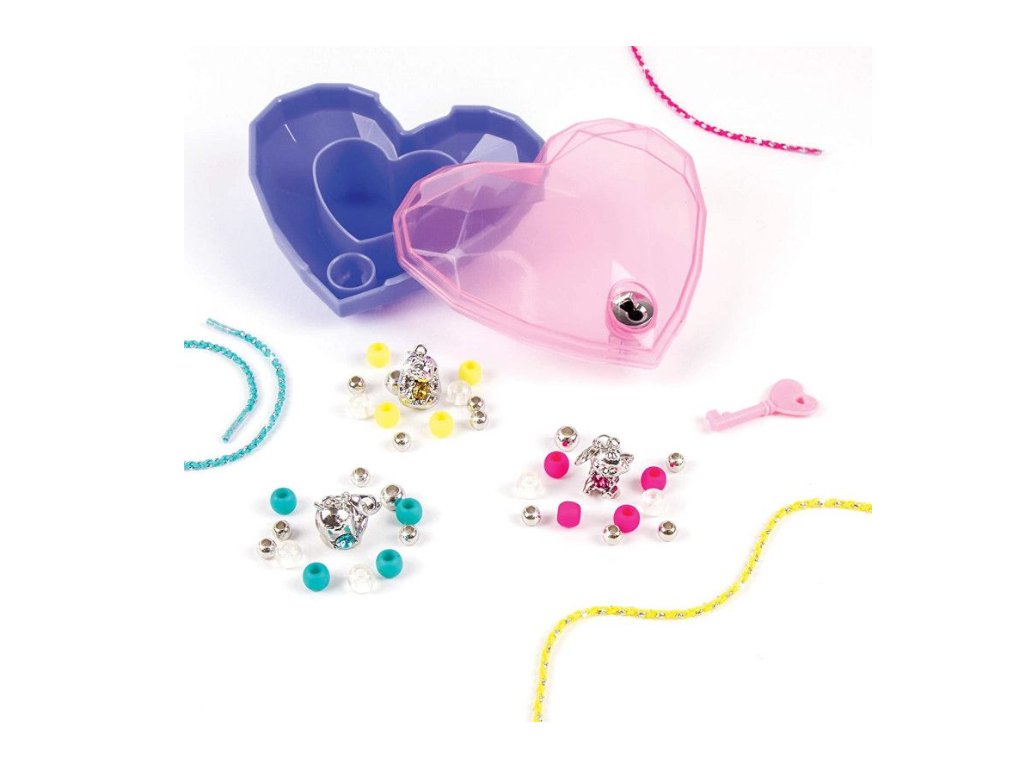 Balení obsahuje 3 náramky s přívěsky a krystalem SWAROVSKI, krabičku ve tvaru srdce, klíček, korálky, barevné šňůry a instrukce.