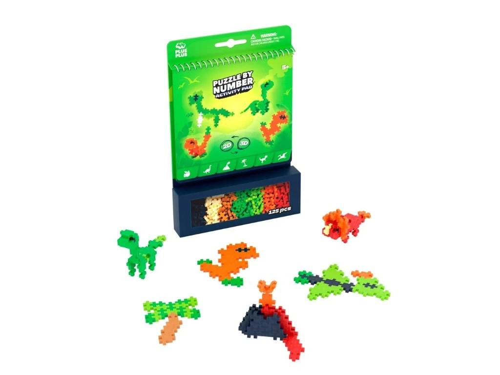Aktivitní podložka Puzzle by Numbers je vzrušující sada typu „vše v jednom“ s 12 zábavnými aktivitami s dinosauří tématikou! Každá stránka umožňuje postavit stejný model ve 2D i 3D, což dětem pomáhá rozvíjet prostorové vnímání a jemnou motoriku a zároveň se skvěle baví. Tato podložka je kompaktní a ideální na cesty nebo na hraní doma bez obrazovky a je plná kreativních prehistorických dobrodružství. Postavte si vlastní dinosaury, vybuchující sopky a starověkou krajinu pomocí 125 barevných dílků Plus-Plus.