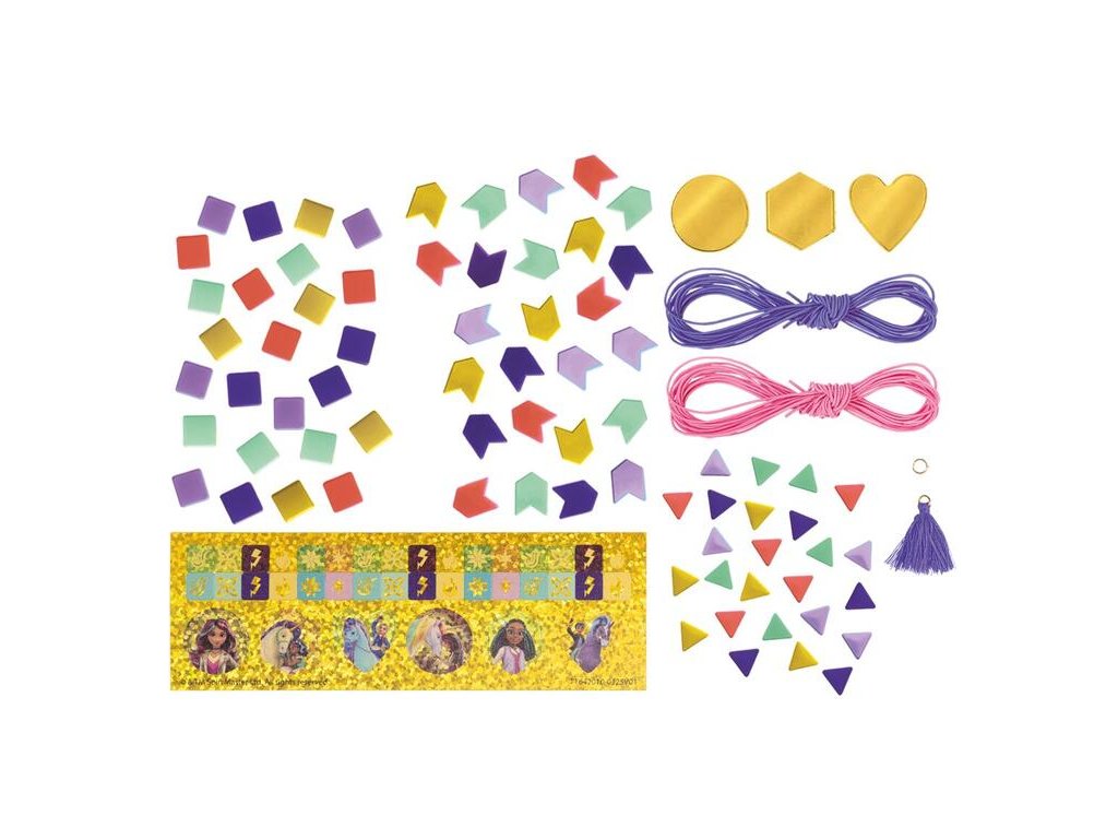 Balení obsahuje: tvarované korálky, arch samolepek, střapce a elastická šňůrka.