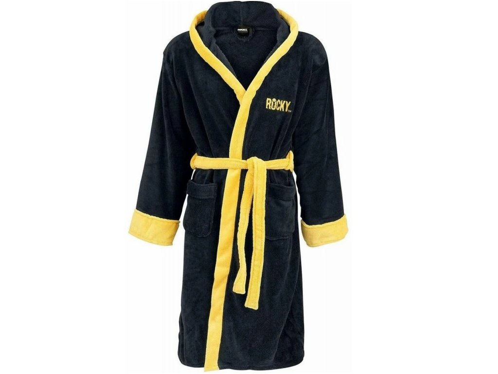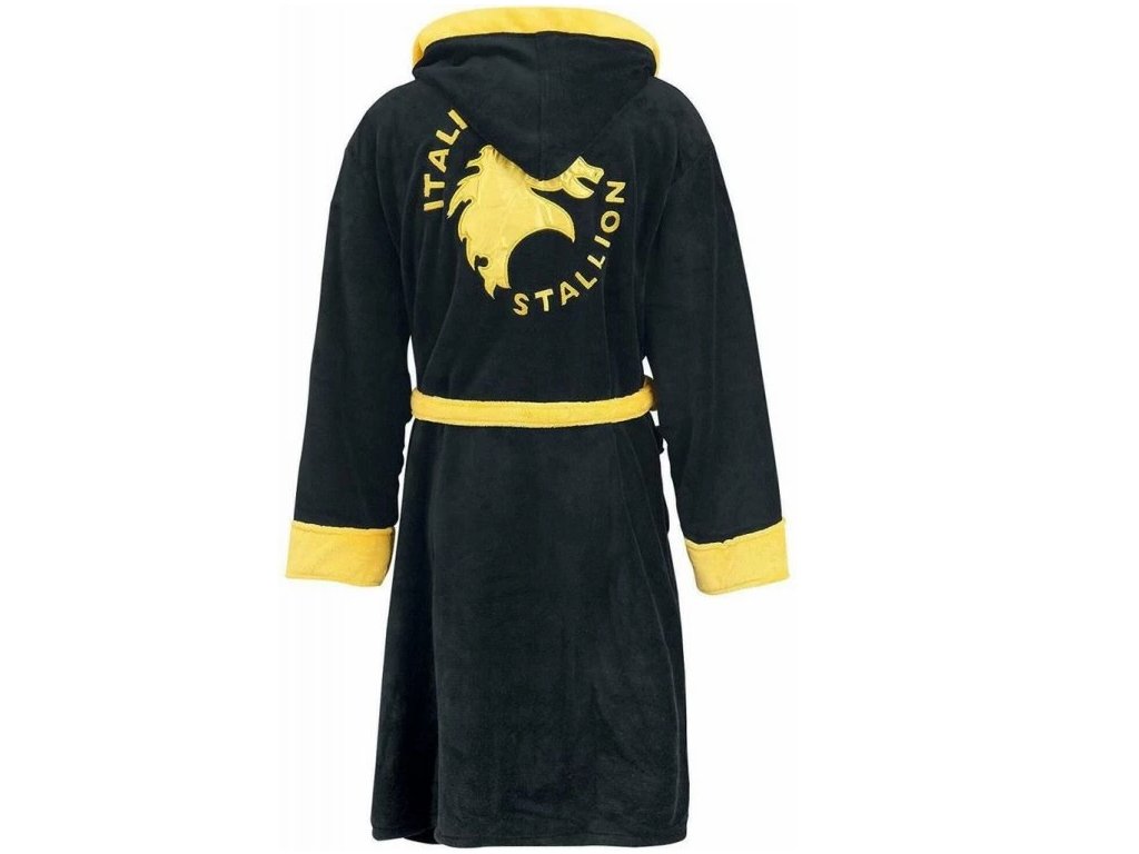 Kvalitní černý pánský župan s kapucí a páskem pro všechny milovníky filmu Rocky. Na hrudi je nápis ROCKY a na zádech jeho přezdívku Italian Stallion (v překladu: Italský hřebec), vše je provedeno ve zlaté barvě.