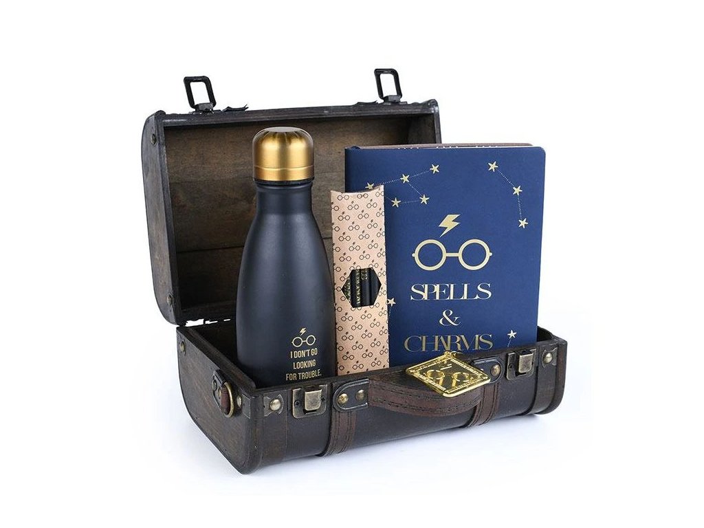 Tato dárková sada je v kufru (s odnímatelným ramenním popruhem) s erbem Bradavické školy. Obsahuje: - 4x tužky- 1x kovovou láhev 350 ml- 1x sešit- 1x kovový klíčenek Rozměry kufru: 26 x 17 x 13 cm