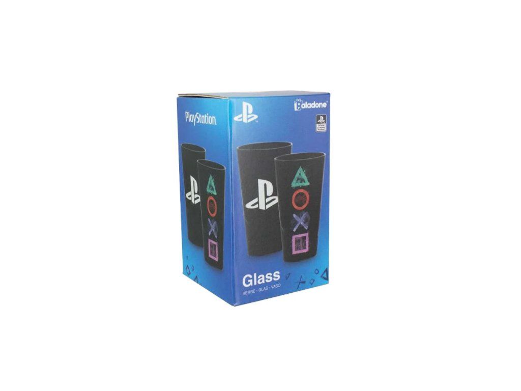 Oficiální sklenice a doplňkové zboží z katalogu produktů s logem, fotografiemi Playstation. Sklenice z čirého skla s logem a grafikou Playstation.