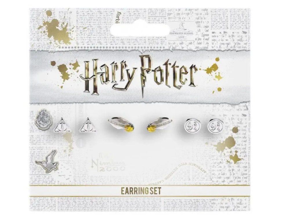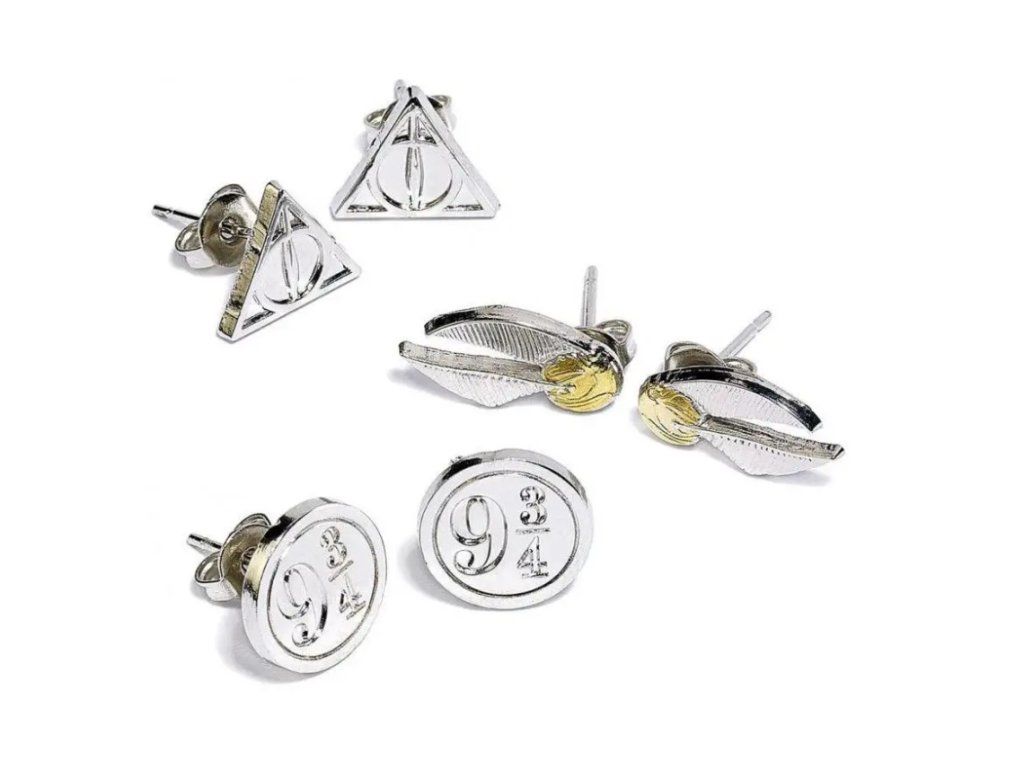 Sada postříbřené naušnice (3 páry)- naušnice Golden Snitch cca 10mm x 10mm- naušnice Deathly Hallows cca 10mm x 10mm- naušnice 9&3 Quaters cca 10mm x 10mm- oficiální licencovaný produkt