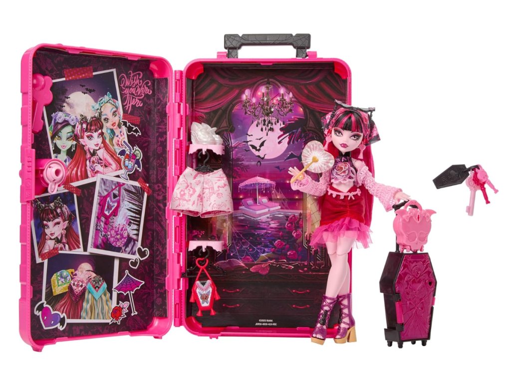 Uvnitř kufru je upír a 19 překvapení… První krok? Použijte klíč skrytý na přední straně krabice k otevření dveří a odhalte panenku Draculaura ve fantastickém resortním oblečení!