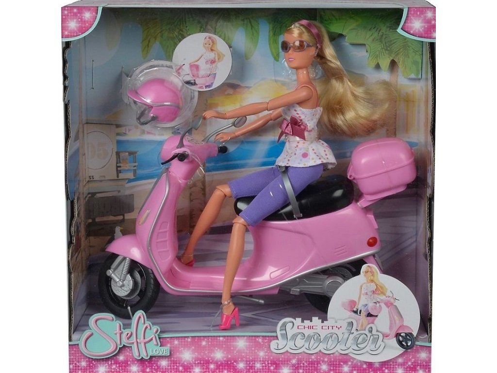 Panenka Steffi se skútrem a snímatelnou přilbou. Velikost: 29 cm.