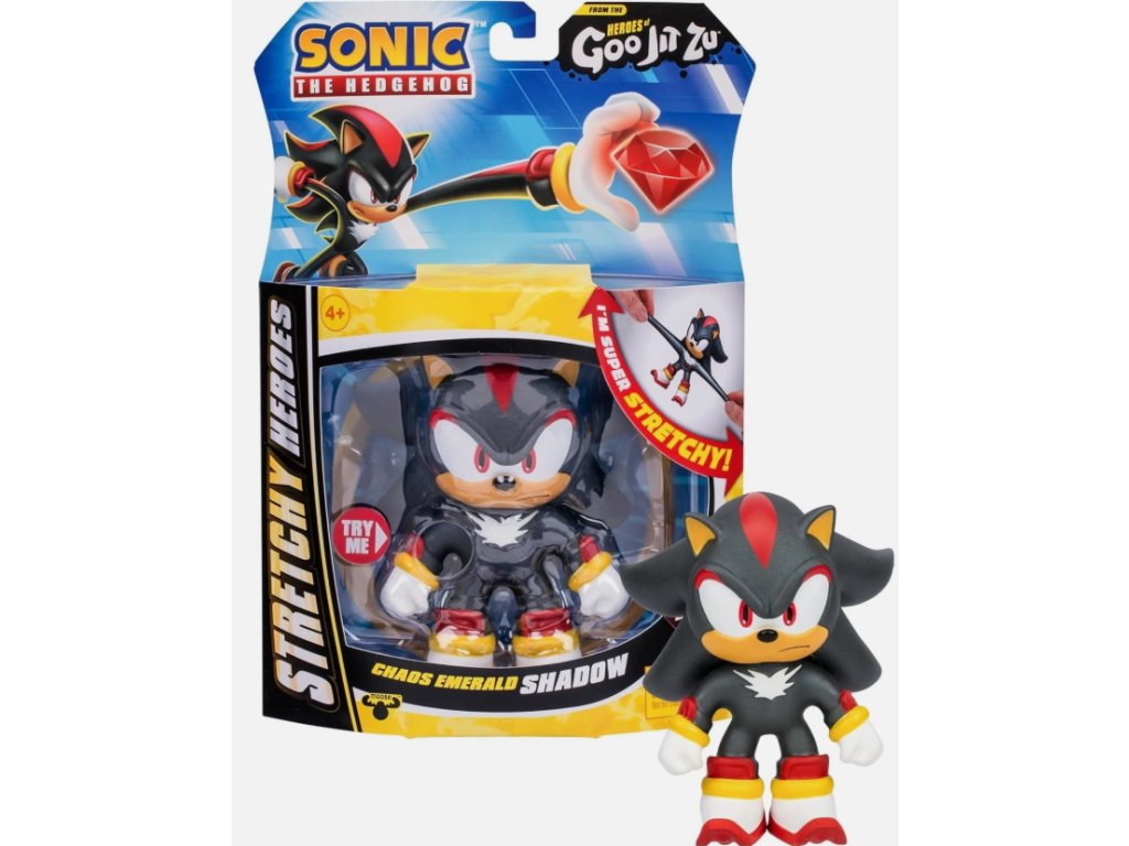 Podívejte se, kdo je zpět s Heroes of Goo Jit Zu - Sonic the Hedgehog - Shadow! Ale teď se z něj stal Chaos Emerald Shadow! Chaos Emerald Shadow vyskočil z obrazovky a dostal se vám do rukou! Je stejně pružný jako Heroes of Goo Jit Zu - Sonic, ale teď má uvnitř svého těla plného slizu ukrytý mocný Chaos Emerald! Zmáčkněte ho, natáhněte a hrajte si s ním jako nikdy předtím! Zmáčkněte Shadowovo tělo a objevte a odhalte Chaos Emerald v jeho slizu! Chyťte ho za končetiny a natáhněte mu ruce a nohy. Shadow měří přes 10 cm. Páni! Dokáže se natáhnout až 3krát víc než je jeho velikost! (Jeho paže se mohou natáhnout až 40 cm!) Pusťte ho a sledujte, jak se vrací do své původní velikosti a tvaru! Heroes of Goo Jit Zu jsou nový pružný způsob, jak si hrát s vašimi oblíbenými postavičkami z hraček - bez nepořádku.