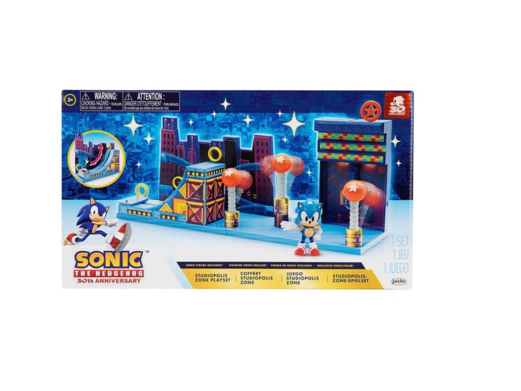 Hrací sada Studiopolis Zone Playset bude jistě hitem u dětí a fanoušků Sonic! Pomocí této mimořádně detailní herní sady a jejích hratelných funkcí můžete znovu vytvořit akci z her. Včetně posuvné rampy, kde můžete se Sonicem uhánět po rampě a uchopit tři prsteny. K dispozici jsou také tři kloubové pružiny. Sonic se může odrazit od pružin a přistát na vrcholu platformy Mic Drop.
