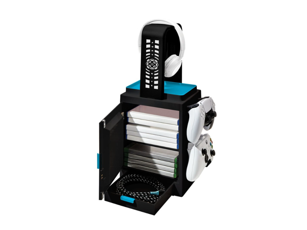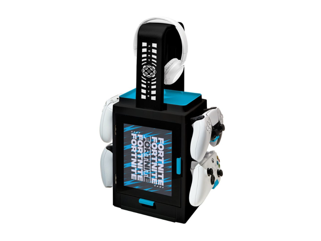 Zde je převratný způsob, jak udržet váš herní prostor uklizený a uspořádaný. Tato světelná skříňka Fortnite nabízí speciální úchyty pro sluchátka a ovladače, integrovaný zásobník pro uložení mobilních zařízení, úložný prostor až pro 10 vašich her pro Xbox One/Xbox Series X|S, PS4/PS5 nebo filmy s dalším prostorem pro uložení všech vašich herních nezbytností. Navíc se stisknutím tlačítka rozsvítí a odhalí úžasnou poctu Fortnite, což je pro fanoušky nutnost.