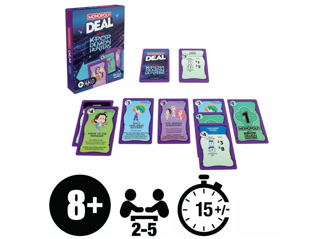 HUNTR/X se připravuje na svůj dosud nejepičtější koncert a potřebuje pomoc svých největších fanoušků! Sbírejte kartičky s předměty, které Rumi, Mira a Zoey potřebují k úspěchu koncertu a zpečetění Honmoonu! Tato hra Monopoly Deal: KPop Demon Hunters kombinuje rychlou akci hry Monopoly Deal s postavami a tématy z hitového filmu Netflixu. Použijte akční karty k virálnímu šíření, zvládněte pikantní výzvu, nasaďte Bobbyho, aby hlídal potíže, a mnoho dalšího! Hráči si přidávají karty fanoušků do svého osobního fanklubu, aby mohli platit ostatním hráčům, kteří je pronásledují. První hráč, který má 3 různé kompletní sady předmětů, vyhrává! Tuto vzrušující rodinnou karetní hru pro děti i dospělé lze hrát přibližně za 15 minut, takže je to ideální hra pro rychlou zábavu kdykoli. Hračky a dětské karetní hry KPop Demon Hunters jsou skvělými vánočními a narozeninovými dárky pro teenagery a děti od 8 let.