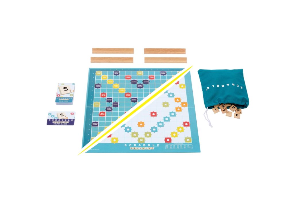 …nebo otočte oboustrannou hrací desku a vyzkoušejte Scrabble Together, speciálně navrženou pro rychlejší, neformálnější a kooperativnější hru se snadným bodováním!