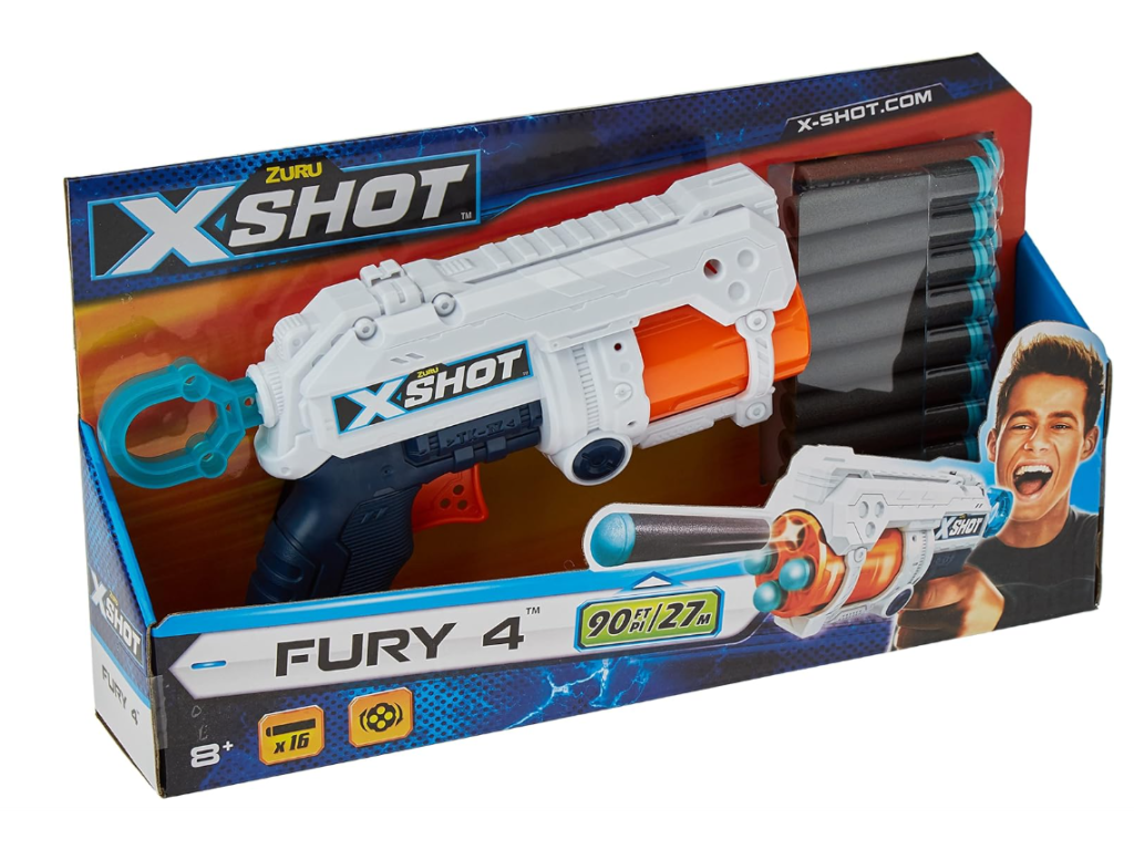 Obsahuje 1 pěnovou šipkovou pistoli Zuru X-Shot Excel Fury 4 a 16 černých pěnových šipek s měkkými modrými hroty.