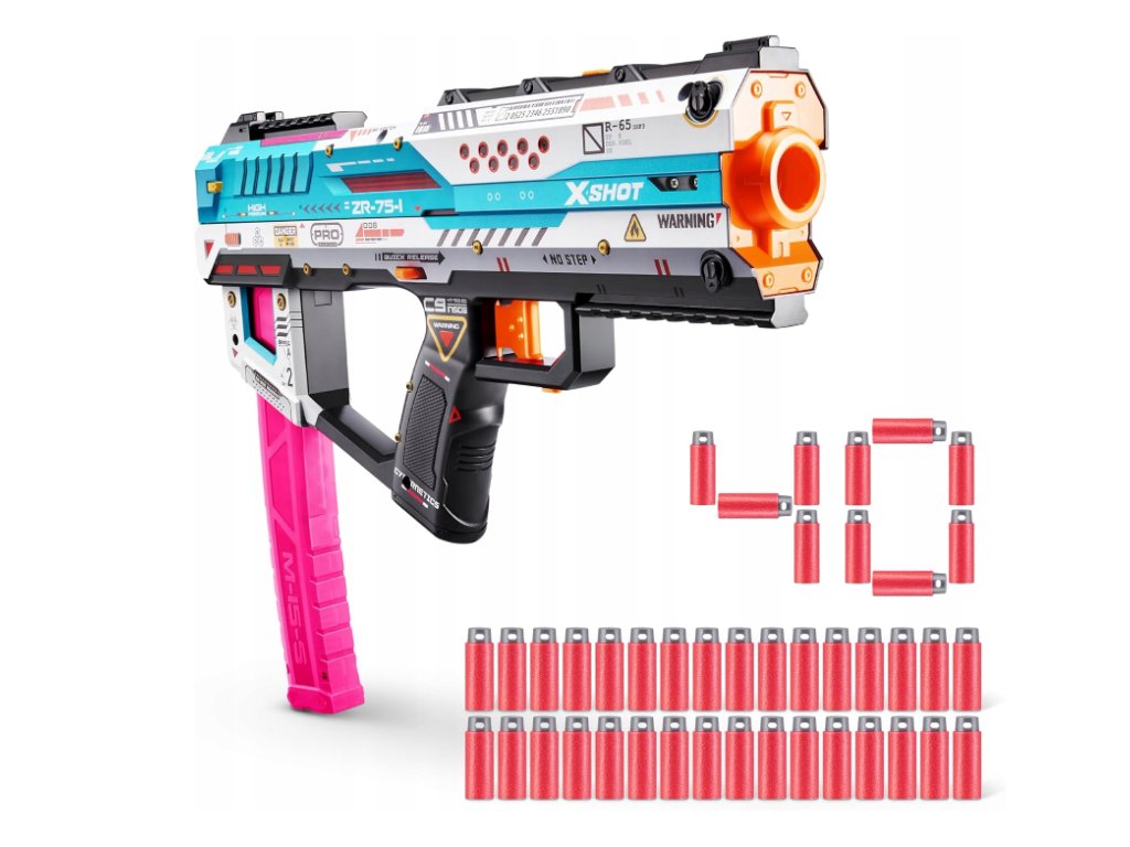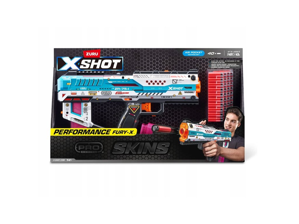 Obsah balení: 1x XSHOT SKINS Pro Series Fury-X Blaster, 40x XSHOT Pro Series Half-Length pěnové šipky Air Pocket Technology.